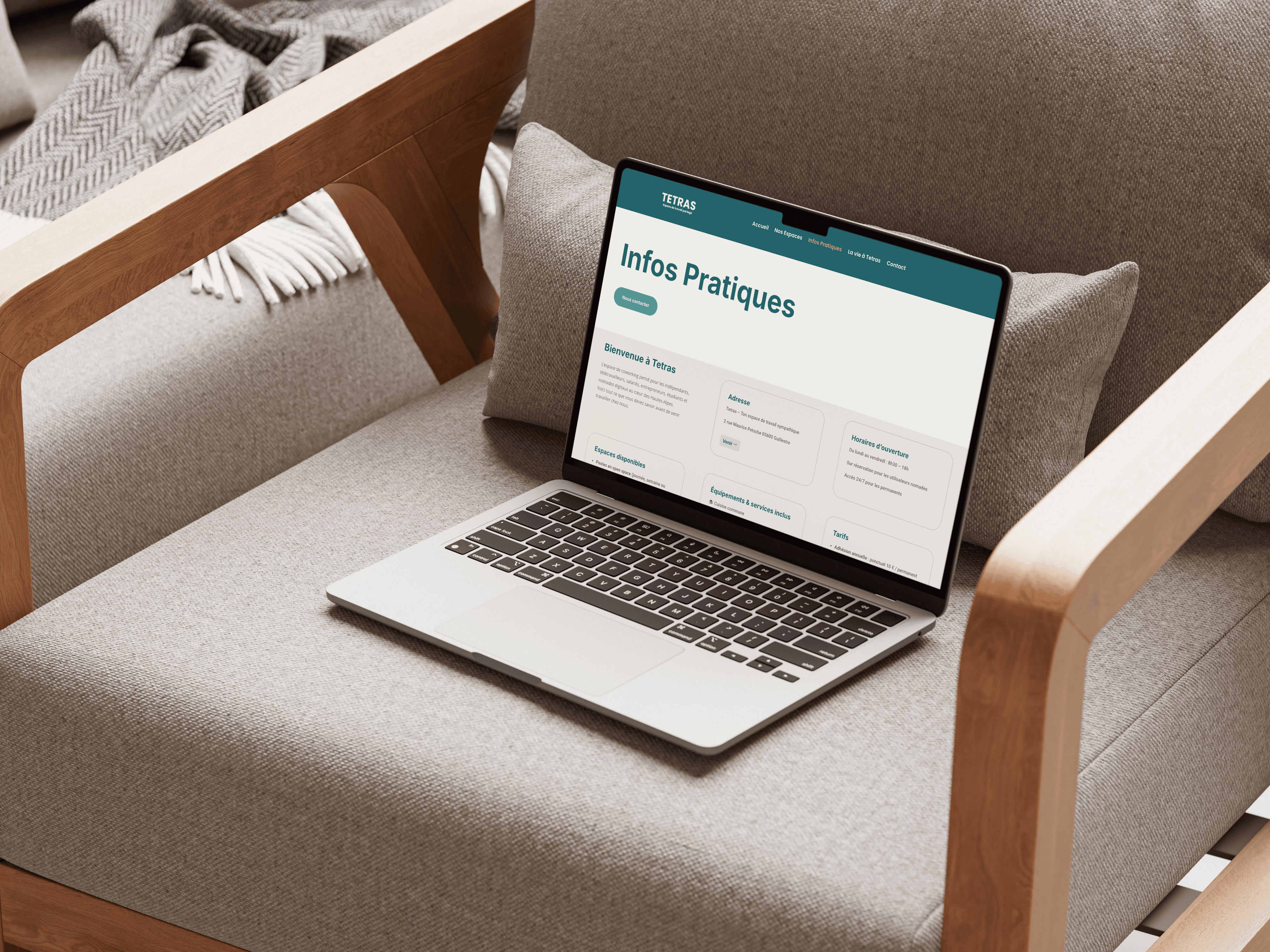 J’ai repris un template Divi et l’ai entièrement adapté à Tetras, en concevant le contenu pour chaque page afin de refléter l’esprit convivial et dynamique du lieu.